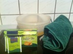 6. Wenn die Heilerde vollständig getrocknet ist, nimmt die Maske eine hellgrüne Farbe an (das sieht natürlich monstermäßig aus…). Das Ganze wasche ich mit lauwarmem Wasser ab.