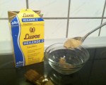5. Nun rühre ich die Heilerdemaske in einer kleinen Schüssel an. Es genügt ein gehäufter Esslöffel Heilerde auf einen EL Wasser. Die leicht flüssige Mischung verteile ich mit einem Backpinsel im Gesicht und lasse sie trocknen.