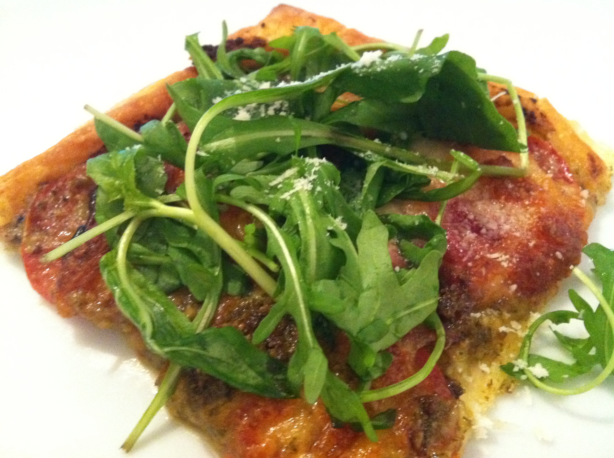 4. Den gewaschenen Rucola darauf verteilen und mit Parmesan bestreuen