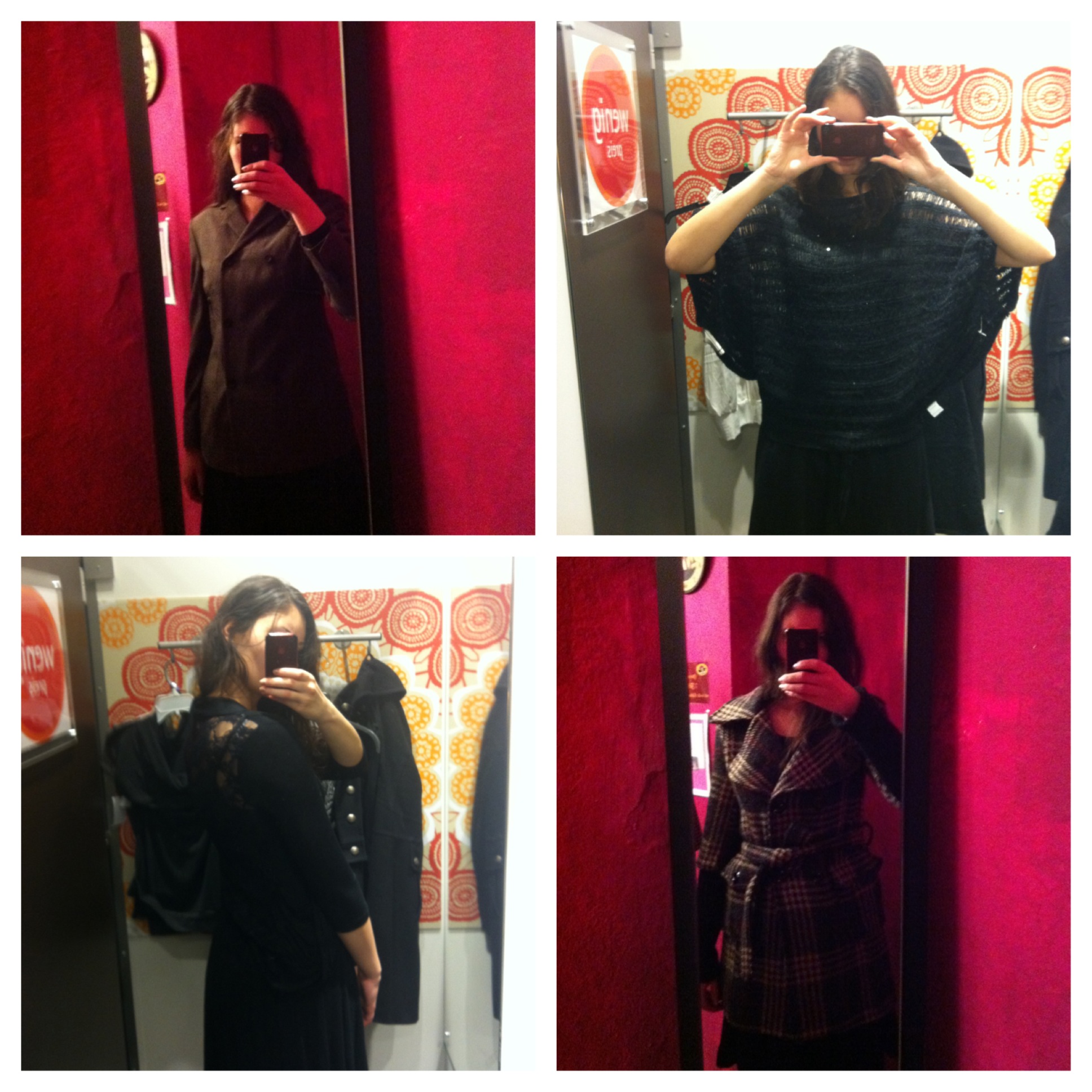 Ich muss mir kurz selbst auf die Schulter klopfen: brav, Anna, du hast sie liegengelassen! Denn obwohl diese Teile alle so besonders sind, dass ich mich nur schwer davon trennen konnte, hätte ich sie wahrscheinlich nicht oft getragen. Der Vintage-Blazer (o.l.) von Toni Gard hat zwar eine tolle Qualität, aber der Schnitt ist mir doch zu streng. Fledermausärmel (o.r.) finde ich an anderen lässig, ich komm mir selbst damit aber verkleidet vor. Spitze (u.l.) ist zart und schön, gerade am Rücken. Aber die Träger von Top und BH machen das Gesamtbild wieder kaputt… Der Mantel (u.r.) ist niedlich; gerade das Karomuster, der große Kragen und die kurzen Ärmel mit den schwarzen Wollärmeln gefallen mir, nicht aber die Länge. Darunter kann man eigentlich nur Jeans tragen und das tu ich eher selten. So haben ausnahmsweise also weder mein Lieblingssecondhandladen noch TK Maxx ganz so viel an mir verdient… Hättet ihr das auch so gemacht? Eigentlich lasse ich alles liegen, bei dem mich schon im Geschäft erste Zweifel überkommen. Dieses Prinzip hat mich zwar schon vor einigen Fehlkäufen bewahrt (bestimmt nicht vor allen!), aber manchem Kleid trauere ich noch Wochen später nach. Was macht ihr im Zweifel: mitnehmen oder liegenlassen?