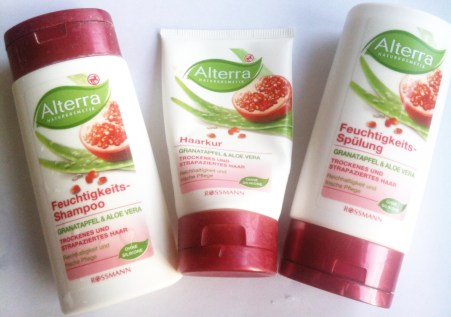 Wobei natürlich angesichts meines Budgets erst einmal ein relativer Begriff ist; gestartet habe ich mit verschiedenen Alverde-Produkten, die aber keine großartige Pflegewirkung gezeigt haben. Meine nächste Wahl war Alterra, die günstige Rossman-Hausmarke, mit der ich einen echten Glücksgriff getätigt habe. Deren Produkte sind leider nicht BDIH-zertifiziert und haben entsprechend nicht die allerbesten Inhaltsstoffe, aber immerhin sind sie silikonfrei. Letztenendes zählt für mich aber vor allem die Wirkung, und die ist vor allem bei der Granatapfel-Serie für trockenes Haar sehr gut.