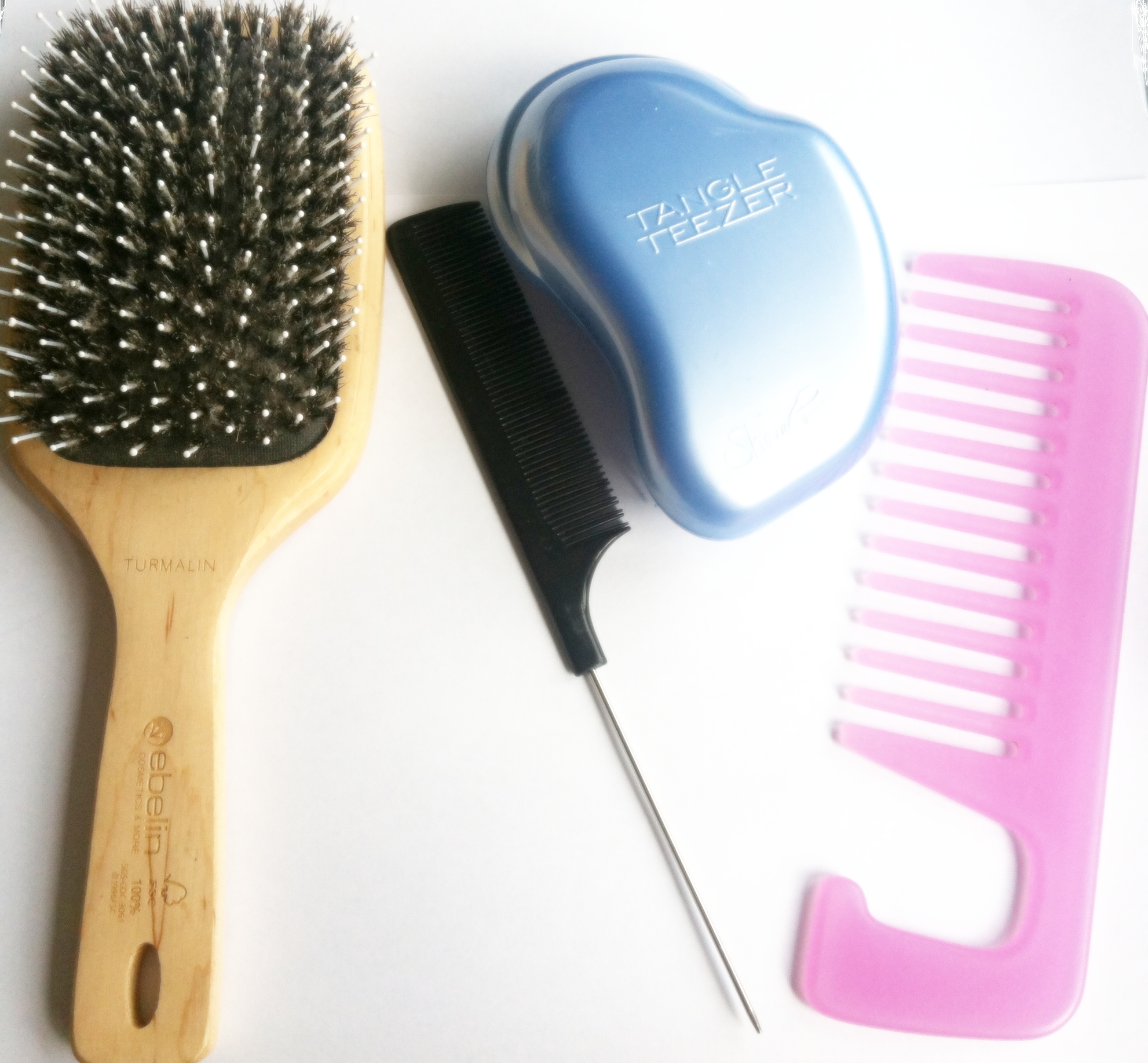 Ansonsten achte ich noch auf die Auswahl meiner Hilfsmittel, zum Beispiel kämme ich meine Haare nass nur mit einem grobzinkigen Kamm und dem Tangle Teezer, meinen Scheitel ziehe ich mit einem Stielkamm. Der Tangle Teezer lädt meine trockenen Haare leider statisch auf, deshalb greife ich sonst zur Paddle Brush von DM.