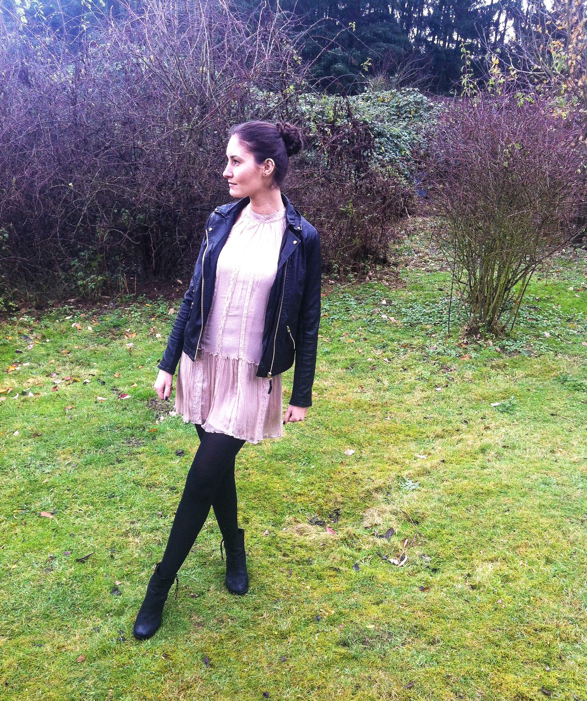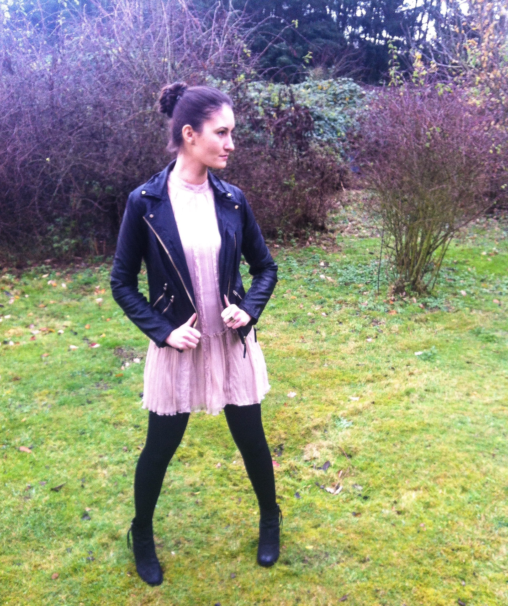 Faux Lederjacke: Bershka (z.Z 29,99€)., Kleid: Zara vintage, Boots: Görtz 17